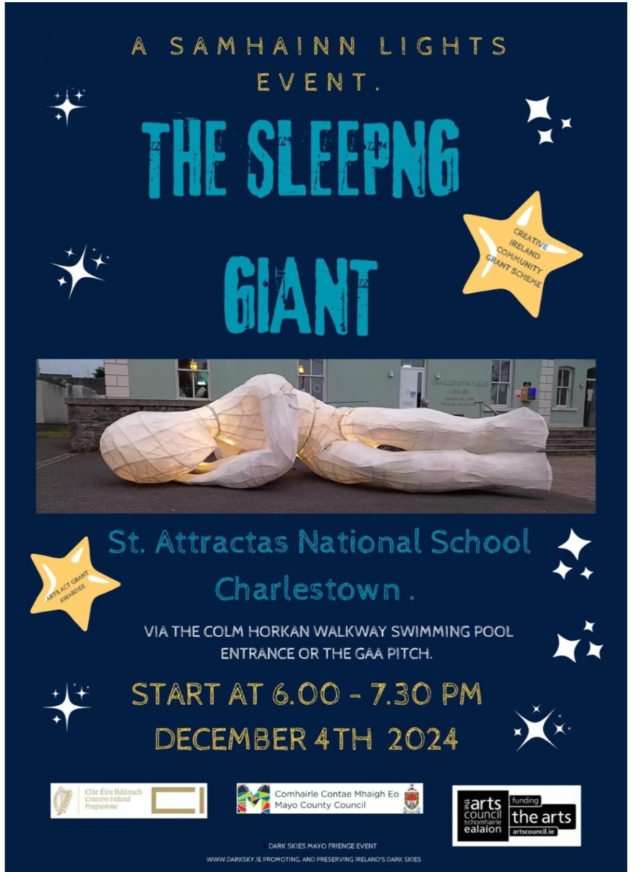 Please note the rescheduled ‘Sleeping Giant’ event takes place on our school grounds this Wednesday evening, December 4th from 6 pm to 7.30 pm. We ask that you enter the school grounds through the Swimming Pool gate to the rear of the school. We sincerely thank Tom Mescall and The Mayo Art Squad for their vision, and hard work allowing our students to be creative, and considerate of their futures and the environment. We look forward to what promises to be a wonderful evening and hope on this occasion the weather is a little kinder.