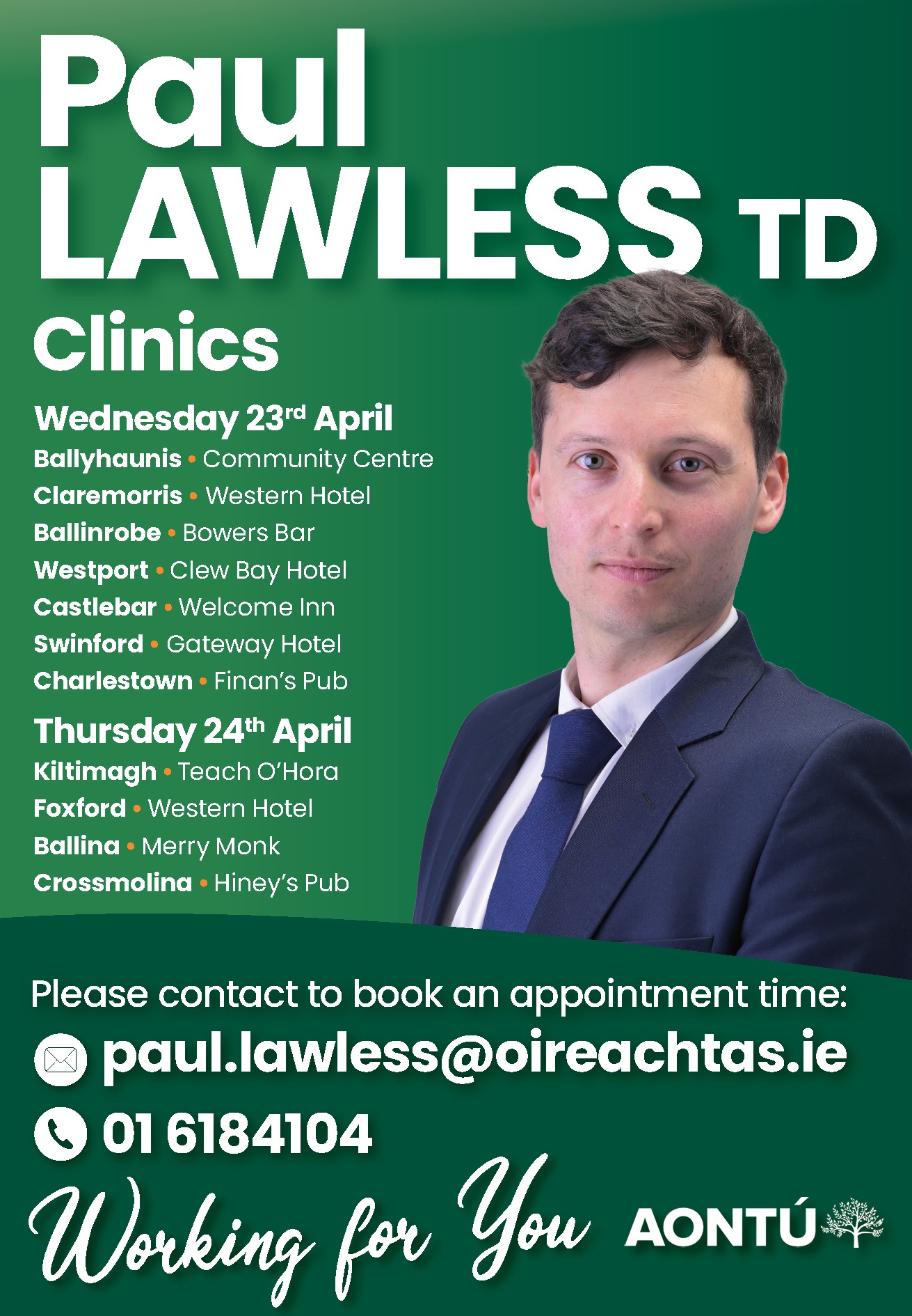 Paul Lawless Constituency Clinic will be held in Finan’s Bar, Charlestown on Wednesday, 23rd April.